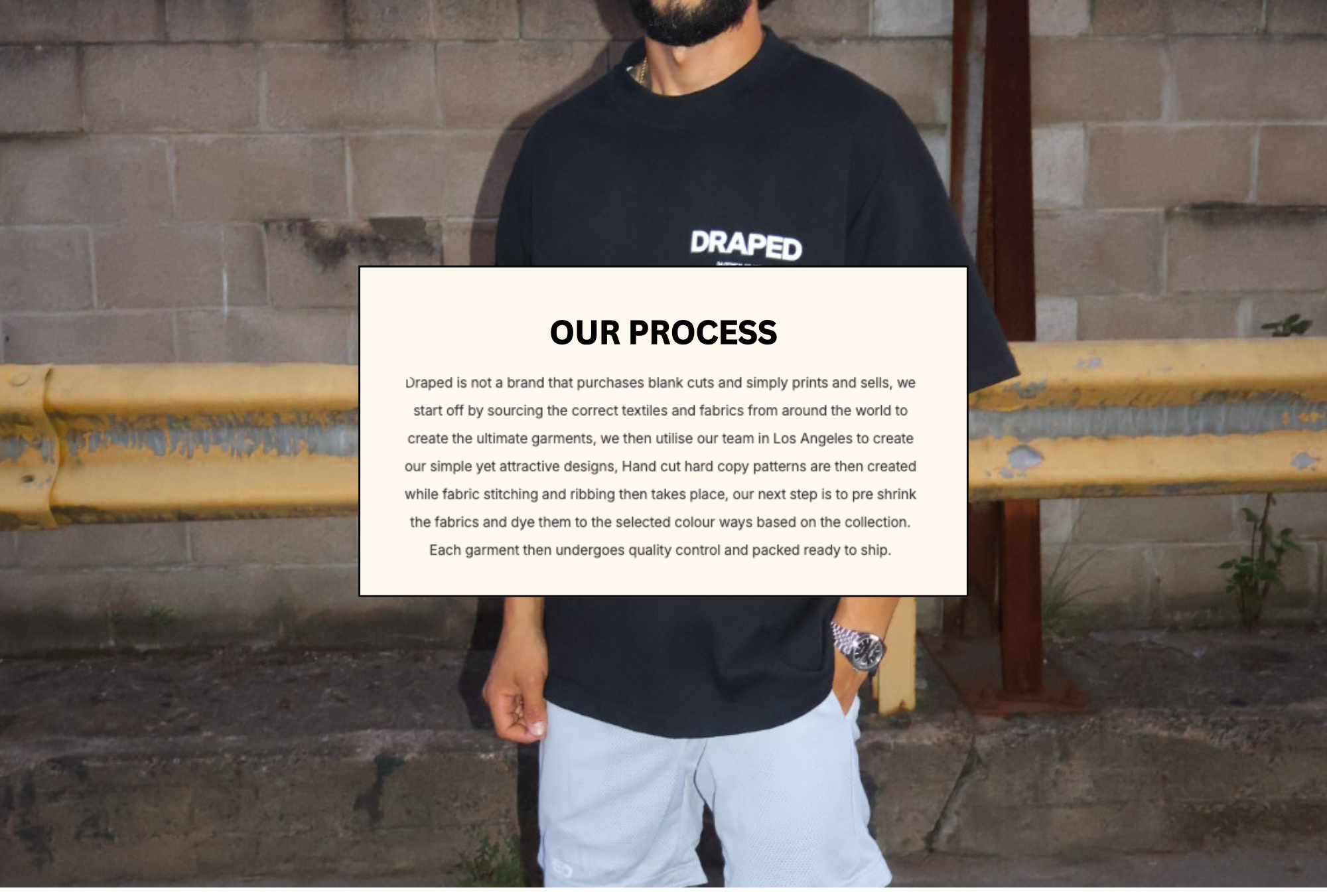 This is the definition that gave us the foundation to lay as a redefined luxury street brand built on quality and comfort. It all started with a love for fashion and an eager urge to learn about fabrics and garments. In 2020, after reviewing swatches from all over the world to source the correct cotton to create what is now Draped. We bring to you a heavy combination of cotton materials and special textile fabrics to receive the silhouettes created. After sourcing materials from all over the globe we decided to design the fit and cuts with a major field player known as "Kolby" from Los Angeles. We were then able to manufacture them right here in Australia to create the ideal fit without compromising any detail.